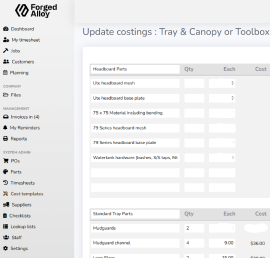 The portal enables the setup of bespoke production checklists and systems. These enable Forged Alloy to create clear internal process for manufacturing and fitouts. Staff can use a tablet to sign off each others work. This all flows from a job costing part of the portal. Sales staff can quickly select the costings templates for a project. Bespoke modifications can then be made to that specific customer job.